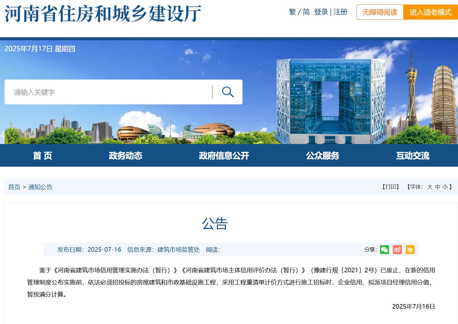 河南省住建廳發布關于房建、市政施工項目招標時信用分計算的公告